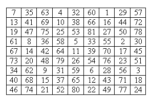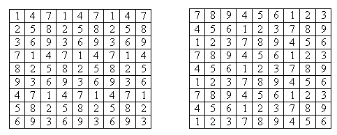 Таблица T, изображённая на рисунке слева, содержит по девять раз каждое из чисел 1, 2, ..., 9 и обладает тем свойством, что сумма чисел в каждом квадрате 3×3 равна 36.