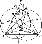 Рассмотрим окружности ω1 и ω2, построенные на диагоналях AC и BD как на диаметрах. Пусть BB1, CC1, AA1, DD1 – высоты треугольников BPC и APD, соответственно (точки A1 и C1 лежат на ω2, B1 и D1 – на ω1). Тогда точки A, D1, A1, D лежат на одной окружности, поэтому H1A·H1A1 = H1D·H1D1, то есть H1 лежит на радикальной оси ω1 и ω2. Аналогично H2 также на ней лежит, следовательно, эта радикальная ось есть прямая H1H2.