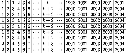 Оценка. Переставив, если нужно, столбцы, будем далее считать, что числа в первой строке стоят в неубывающем порядке. Пусть ai – i-е число первой строки. Рассмотрим сумму S = (a1 – 1) + (a2 – 1) + (a3 – 1) + (a4 – 2) + ... + (ai – (i – 2)) + ... + (a2003 – 2001) + (a2004 – 2001).