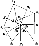 Предположим, что пятиугольник B1B2B3B4B5 – выпуклый. Возьмём внутри него точку X и опустим из неё на прямые A1A2, A2A3, ..., A5A1 перпендикуляры XH1, XH2, ..., XH5 соответственно (см. рис.).