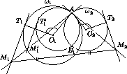 Окружности σ 1 и σ 2 пересекаются в точках A и B . В точке A к σ 1 и σ 2 проведены соответственно касательные l1 и l2 . Точки T1 и T2 выбраны соответственно на окружностях σ 1 и σ 2 так, что угловые меры дуг T1A и AT2 равны (величина дуги окружности считается по часовой стрелке). Касательная t1 в точке T1 к окружности σ 1 пересекает l2 в точке M1 . Аналогично, касательная t2 в точке T2 к окружности σ 2 пересекает l1 в точке M2 . Докажите, что середины отрезков M1M2 находятся на одной прямой, не зависящей от положения точек T1 , T2 .