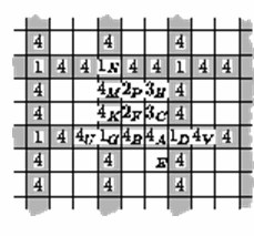Из того, что в клетку K записано число 4, следует, что в M записано 4, в N записано 1, и тогда однозначно восстанавливаются числа в выделенных строках и столбцах (см. рис.).