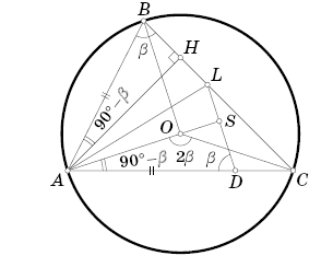 Пусть β > 90°. Тогда ∠HAB = β – 90° = ∠OAC, причём лучи AO и AH лежат вне угла BAC, а значит, также симметричны относительно AL.