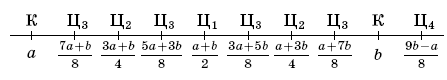 а) Рассмотрим какой-нибудь цвет, например, красный. Найдём два числа красного цвета, разность которых делится на 8 (такие найдутся, потому что число остатков при делении на 8 конечно и, взяв два красных числа с одинаковым остатком, мы получаем искомую пару). Обозначим эти числа через a и b, а цвет числа ½ (a + b) через Ц1. При этом ¼ (3a + b) и ¼ (a + 3b) имеют один и тот же цвет Ц2 (полусумма чисел красного цвета и Ц1).