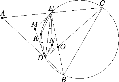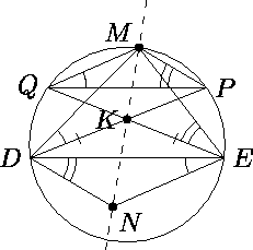 Олимпиадная задача по планиметрии для 9-10 классов: прямая MN и дуга DE в треугольнике
