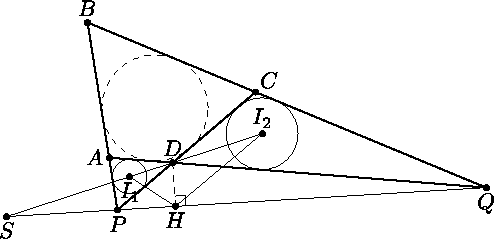 Наоборот, если I1I2 || PQ , то прямые DA и DC симметричны относительно прямой DH (как касательные к ω1 и ω2 )