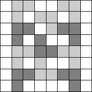 В каждом квадрате2× 2, по крайней мере, две клетки должны быть покрыты уголками, (иначе в такой квадрат поместится еще один уголок). Квадрат8× 8можно разбить на16квадратов размером2× 2каждый, то есть уголками должно быть покрыто не менее тридцати двух клеток, для чего потребуется не менее, чем11уголков. Пример размещения одиннадцати уголков — см. рис.