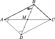 Продлим медиану BM за точку M на ее длину и получим точку D (см. рис.). Так как AB = 2BM = BD, то треугольник ABD – равнобедренный. Следовательно, ∠BAD = ∠BDA = (180° – 40°) : 2 = 70°.