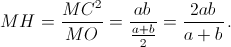 Точка M лежит вне окружности с центром O. Прямая OM пересекает окружность в точках A и B, прямая, проходящая через точку M, касается окружности в точке C, точка H – проекция точки C на AB, а перпендикуляр к AB, восставленный в точке O, пересекает окружность в точке P. Известно, что MA = a и MB = b. Найдите MO, MC, MH, MP и расположите найденные значения по возрастанию.