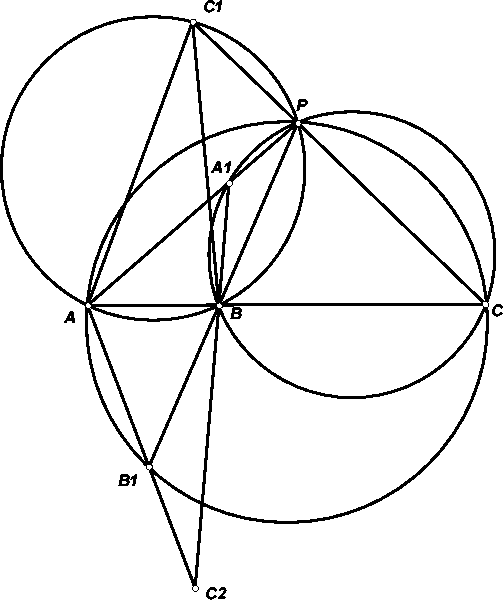 Так как четырёхугольники PAB1C и PBAC1 вписанные, ∠CAC2 = ∠CAB1 = ∠CPB1 = ∠BAC1 (см. рис.). Аналогично ∠ABC2 = ∠ABC1, то есть точки C1, C2 симметричны относительно прямой AB. Повторив это рассуждение для двух других пар точек, получим, что треугольники A1B1C1 и A2B2C2 симметричны относительно этой прямой и, следовательно, равны.