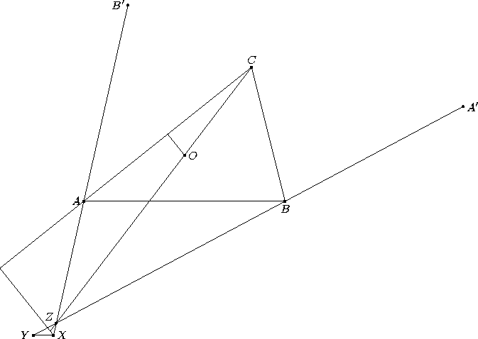 Возьмём прямые da, db совпадающими с прямой AB. Пусть A', B' – точки, симметричные A, B относительно противоположных сторон треугольника. Тогда Z – точка пересечения прямых AB' и BA', а Y и X – точки пересечения этих прямых с прямой, параллельной AB и лежащей вдвое дальше от точки C. Заметим, что точки C и O равноудалены от прямых AB' и BA', то есть биссектриса угла XZY совпадает с прямой CO. Кроме того, нетрудно видеть, что биссектрисы углов ZXY и ZYX перпендикулярны AC и BC соответственно.