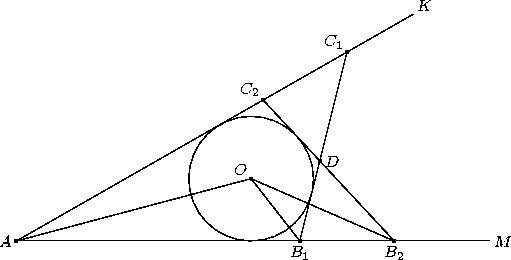 Точки B1 и B2 лежат на луче AM, а точки C1 и C2 на луче AK. Окружность с центром O вписана в треугольники AB1C1 и AB2C2.