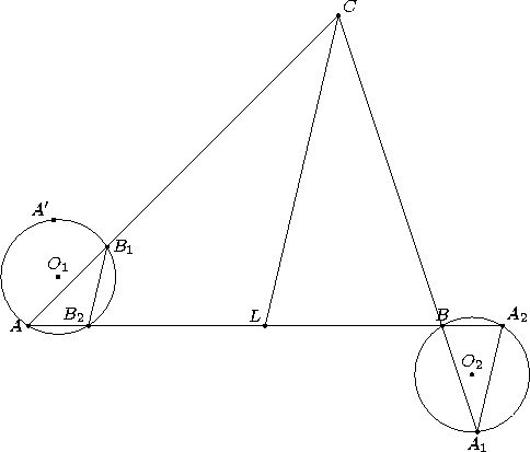 ∠A'AB2 + ∠ A'B1B2 = ∠A + ∠B + 2·½ ∠C = 180°. Следовательно, четырёхугольник AA'B1B2 – вписанный и точки O1, O2 симметричны относительно CL.