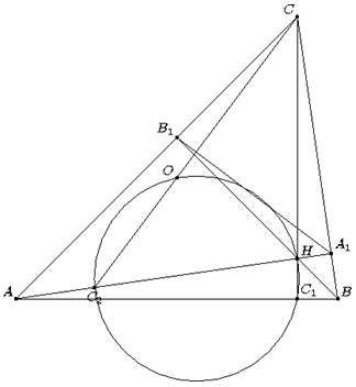 Как известно, треугольники ABC и A1B1C подобны с коэффициентом cos∠C. Значит, поскольку ∠ACO = BCC1 = 90° – ∠B, прямая CO содержит высоту треугольника A1B1C, то есть точки C, O, C2 лежат на одной прямой (см. рис.). Кроме того, CC2 : CC1 = 2 cos∠C. С другой стороны, CH = 2CO cos∠C (это следует из того, что при гомотетии с центром в точке пересечения медиан и коэффициентом 2 точка O переходит в H). Следовательно,