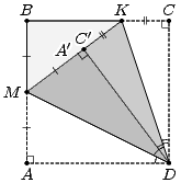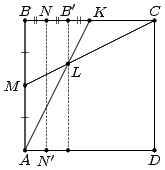 Пусть дан квадрат ABCD. Первый способ. Разделим стороны AB и BC на две равные части. Для этого согнём его так, чтобы точка A совпала с точкой B, а затем так, чтобы точка B совпала с точкой C. Cгибая квадрат по отрезкам CM и AK (медианам треугольника ABC), построим L – точку пересечения его медиан (рис. слева). Затем согнём квадрат так, чтобы сторону AB прошла через точку L и при этом образ B' точки B попал на отрезок BC. Обозначим линию сгиба NN'. Тогда, поскольку ML = ⅓ MC, то по теореме Фалеса BB' = ⅓ BC = ⅓, следовательно, BN = B'N = ⅙ и NC = ⅚.