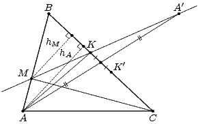 Заметим, что из равенства SKMC + SKAC = SABC следует, что SKMC = SABK, откуда BK : CK = hM : hA, где hA и hM – перпендикуляры, опущенные на прямую BC из точек A и соответственно (см. рис.). Кроме того, из подобия следует, что BM : BA = hM : hA. Пусть K' – точка, симметричная K относительно середины стороны BC. Тогда BM : BA = BK : CK = BK : BK', что означает параллельность прямых MK и AK'. Следовательно, эти прямые симметричны относительно середины стороны BC, то есть прямая MK проходит через точку A', симметричную A относительно середины стороны BC.