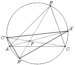 Лемма 1. B окружность вписан треугольник ABC. Пусть вписанный в ту же окружность треугольник A'B'C' вращается вокруг её центра O. Tогда существует единственное положение треугольника A'B'C', при котором прямые AA', BB' и CC' пересекаются в одной точке P (см. рис.).