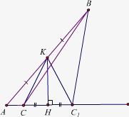 Таким образом, в треугольниках ABC и ABC1 угол A – общий, высота, проведённая из вершины B – общая, и равны медианы CK и C1K, проведённые из вершин C и C1.