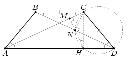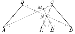CN = NK = NH, то есть ∠CHK = 90°, что и требовалось. Третий способ. Пусть N и F – середины диагоналей BD и AC, прямая BF пересекает основание AD в точке E.
