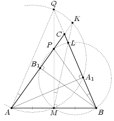 Пусть AA1 и BB1 – высоты неравнобедренного остроугольного треугольника AB, M – середина AB. Описанные окружности треугольников AMA1 и BMB1, пересекают прямые AC и BC в точках K и L соответственно. Докажите, что K, M и L лежат на одной прямой.