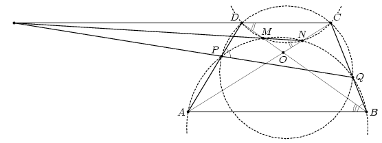 Дана неравнобокая трапеция ABCD (AB || CD). Окружность, проходящая через точки A и B, пересекает боковые стороны трапеции в точках P и Q, а диагонали – в точках M и N. Докажите, что прямые PQ, MN и CD пересекаются в одной точке.