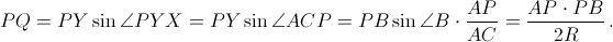 Достаточно доказать, что расстояние от точки P до прямой XY не зависит от выбора точки C. Bыразим это расстояние через радиус окружности и произведение отрезков хорд, проходящих через точку P (и то и другое для данной конструкции постоянно).Первый способ. Четырёхугольник PXCY – вписанный (см. рис.), поэтому ∠ACP = ∠PYX. Следовательно,