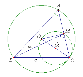 Пусть искомый треугольник АВС, в котором: BС = a; ∠BAC = α; BM = m (M – середина АС), построен (см. рис.). Вершина А лежит на дуге ВС окружности с центром О, описанной около треугольника, то есть, принадлежит ГМТ, из которых данный отрезок ВС виден под заданным углом α. Точка М находится на заданном расстоянии m от точки В, то есть, лежит на окружности с центром В и радиусом m. Кроме того, точка М является серединой хорды АС, поэтому ∠ОМС = 90°, то есть, эта точка лежит на окружности с диаметром ОС.Таким образом, этапы построения:1) отрезок ВС длиной а;