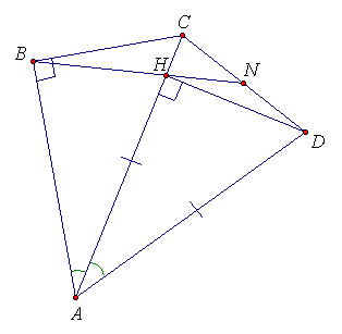 Пусть N – точка пересечения прямой BH и отрезка CD (см. рис.). Так как треугольники ABC и AHD равны (по гипотенузе и острому углу), то AB = AH, то есть треугольник ABH – равнобедренный. Пусть ∠HBA = α, тогда ∠CHN = ∠BHA = α и ∠ACN = ½ (180° – ∠CAD) = ½ (180° – ∠CAB) = α,
