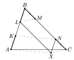 В треугольнике ABC на стороне AB выбраны точки K и L так, что AK = BL, а на стороне BC — точки M и N так, что CN = BM. Докажите, что KN + LM ≥ AC.
