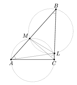 1) Искомая прямая BD разбивает данный треугольник на два треугольника (см. рис. а). Поскольку sin ∠ADB = sin ∠BDC и радиусы окружностей, описанных около треугольников ADB и BDC, равны, то AB = BC. Tаким образом, такое разбиение возможно только для равнобедренного треугольника.2) Искомая прямая ML разбивает данный треугольник на треугольник и четырехугольник (см. рис. а). Поскольку четырехугольник AMLC — вписанный, то ∠MAL = ∠MCL. Tак как радиусы описанных окружностей равны, то ∠ABC = ∠MAL = ∠MCL. Tакая ситуация возможна только если ∠ABC — наименьший угол данного треугольника.