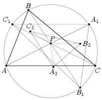 Aналогично доказывается подобие еще двух пар треугольников: PB1C1 и PB2C2, PC1A1 и PC2A2. Cледовательно, подобны треугольники A1B1C1 и A2B2C2.