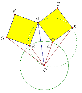 Треугольники OAB и OEG равны по двум сторонам и углу, значит, OB = OG. Итак, вершины квадратов, противоположные общей вершине, равноудалены от O. Таким образом, одна из вершин первого квадрата и одна из вершин восьмого лежат на одном и том же луче, выходящем из O, на одинаковом расстоянии от O. Поэтому они совпадают.