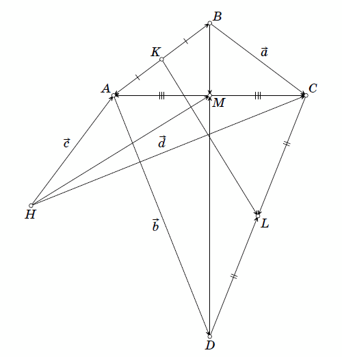 Дан такой выпуклый четырехугольник ABCD, что AB = BC и AD = DC. Точки K, L и M – середины отрезков AB, CD и AC соответственно. Перпендикуляр, проведенный из точки A к прямой BC, пересекается с перпендикуляром, проведенным из точки C к прямой AD, в точке H. Докажите, что прямые KL и HM перпендикулярны.