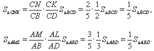 На сторонах AB, BC, CD и AD выпуклого четырёхугольника ABCD расположены точки M, N, K и L соответственно, причём AM : MB = 3 : 2, CN : NB = 2 : 3, CK = KD и AL : LD = 1 : 2. Найдите отношение площади шестиугольника MBNKDL к площади четырёхугольника ABCD.