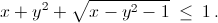 Два последних слагаемых в левой части неравенства неотрицательны, поэтому x ≤ 1. Подкоренное выражение также неотрицательно, поэтому x ≥ 1. Значит, x = 1. Теперь из неравенства следует, что y = 0.