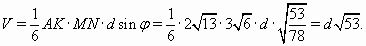 ПустьV– объём тетраэдраAKMN. Тогда, с одной стороны V= ⅓SAKM·NP= ⅓·½AM·AD·NP= ⅓·½·3·6·6 = 18, с другой стороны, еслиd– искомое расстояние между прямымиAKиMN, то