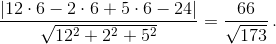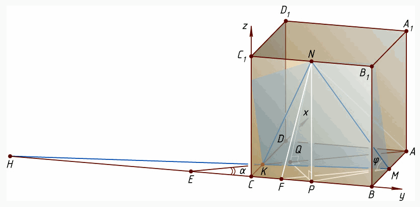 Выберем прямоугольную систему координат, приняв за начало точку C, направив ось CX по лучу CD, ось CY – по лучу CB, а ось CZ – по лучу CC1. Найдём координаты нужных нам точек: C(0, 0, 0), K(2, 0, 0), A(6, 6, 6), H(0, –12, 0), N(0, 3, 6). Уравнение плоскости MNK имеет вид