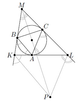 Решение 2:Пусть прямые BK и CL пересекаются в точке M. Прямая KP, параллельная основанию равнобедренного треугольника ABK, является биссектрисой внешнего угла при вершине K. Аналогично LP – биссектриса внешнего угла при вершине L. Следовательно, P – центр вневписанной окружности треугольника KLM, касающейся стороны KL и поэтому лежит на биссектрисе угла M. Поскольку MB = MC, точки B и C симметричны относительно этой биссектрисы. Значит, и отрезки PB и PC также симметричны.