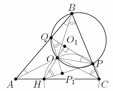 Обозначим ∠OBA = ∠OAB = α, ∠OBC = ∠OCB = γ; тогда ∠ACB = ½ ∠AOB = 90° – α. Поскольку четырёхугольник BPOQ вписан, ∠OPQ = α и ∠OQP = γ. Пусть OO1 – высота треугольника OPQ, а H – точка пересечения прямых OO1 и AC. Без ограничения общности можно считать, точка H лежит на луче CA.