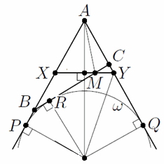 Поскольку отрезки BC и XY пересекаются, можно считать, что AB > AX и AC < AY. Пусть вневписанная окружность ω исходного треугольника касается стороны BC в точке R, а продолжений сторон AB и AC в точках P и Q соответственно (см. рис.).
