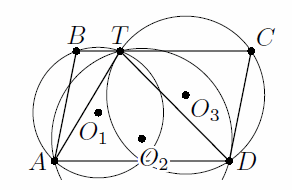 Решение 1: Прямые O1O2 и O3O2 – серединные перпендикуляры к отрезкам AT и DT. Значит, ∠AO1O2 = ∠TO1O2 = ∠TBA (поскольку угол TO1A – центральный для описанной окружности треугольника ABT). Аналогично ∠DO3O2 = ∠TCD. Отсюда ∠TO1O2 + ∠TO3O2 = 180°. Итак, точки T, O1, O2, O3 лежат на одной окружности ω (рис. слева).