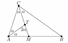 В треугольнике ABC биссектриса угла C пересекает сторону AB в точке M, а биссектриса угла A пересекает отрезок CM в точке T. Оказалось, что отрезки CM и AT разбили треугольник ABC на три равнобедренных треугольника. Найдите углы треугольника ABC.