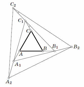 Приведём два примера такого замощения. Пример 1. Отложим на продолжениях сторон вырезанного треугольника точки A1, B1, C1 так что AA1 = BB1 = CC1 = xAB (рис. слева). Треугольники A1AB1, B1BC1 и C1CA1 равны, а треугольник A1B1C1 – равносторонний. Теперь продлим стороны треугольника A1B1C1 и отметим на продолжениях точки A2, B2, C2 так, что A1A2 = B1B2 = C1C2 = xA1B1. Треугольники A2A1B2, B2B1C2 и C2C1A2 равны между собой и подобны треугольнику A1A2B1. Аналогично построим точки A3, B3, C3 и так далее. Размеры треугольников AkBkCk растут как геометрическая прогрессия, поэтому вся плоскость будет покрыта. Таким образом, мы получили разбиение плоскости на подобные треугольники вида AiBi–1Bi, BjBj–1Cj и CkCk–1Ak.