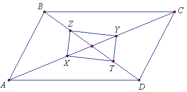 Четырёхугольник XZYT, как и вся картинка, симметричен относительно центра O параллелограмма ABCD (см. рис.).