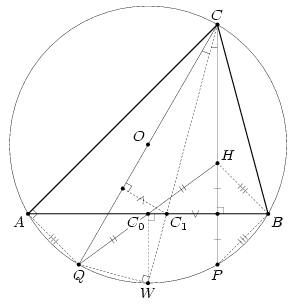 1) Построим точку W как пересечение окружности с диаметром C1Q и перпендикуляра к C0C1, проведённого в точке C0.