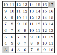 Пусть, например, клетка A, в которой три зёрнышка, находится на k клеток левее и на n клеток ниже, чем клетка B, в которой 17 зернышек. Рассмотрим кратчайшие пути, ведущие из клетки A в клетку B. Каждый такой путь состоит из k шагов на соседнюю клетку вправо и n шагов на соседнюю клетку вверх, сделанных в произвольном порядке, то есть в любом случае такой путь состоит из k + n шагов. На каждом шаге количество зёрен меняется ровно на 1, а за весь путь количество зёрен изменяется на 17 – 3 = 14. Но, исходя из размеров шахматной доски, количество возможных шагов как вверх, так и вправо не может быть больше 7, то есть кратчайший путь не может содержать больше 14 шагов. Следовательно, должно быть ровно 7 шагов вправо и ровно 7 шагов вверх, причём на каждом шаге количество зёрен должно увеличиваться. Значит, если клетка A ниже и левее, чем клетка B, то они обе лежат на главной диагонали, ведущей вправо-вверх (A – в левом нижнем углу, а B – в правом верхнем). В этом случае количество зёрен в каждой клетке восстанавливается однозначно (см. рис.).