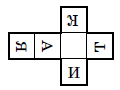 Посмотрим на первый кубик справа и нарисуем на развёртке буквы А и И (рис. слева). Затем посмотрим на второй кубик и нарисуем на развёртке буквы К и Т (рис. справа). И, наконец, посмотрев на третий кубик, нарисуем букву Н. Проверим, что четвёртый кубик действительно соответствует нашей развёртке.
