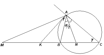 Заметим, что ∠MAN = 90°, так как этот угол образован биссектрисами смежных углов (см. рисунок). Обозначим величины углов A и C данного треугольника через α и γ соответственно. Тогда ∠KAB = ∠ACB = γ (угол между касательной и хордой), ∠KNA = α/2 + γ (внешний угол треугольника ACN). Значит, в треугольнике AKN ∠KAN = α/2 + γ = ∠KNA, следовательно, KA = KN. Таким образом, AK – медиана прямоугольного треугольника MАN, проведённая к гипотенузе, то есть K – середина MN.