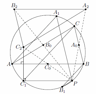 Проведём через A1, B1 и C1 прямые a, b и c, параллельные соответственно BC, CA и AB; покажем, что они вторично пересекают описанную окружность в одной и той же точке. Действительно, пусть c пересекает окружность вторично в точке P (если она касается окружности, то P = C1). Тогда, поскольку AB || C1P и AA1 || CC1, (направленные) дуги BP, C1A и A1C равны. Это и означает, что A1P || BC, то есть a проходит через P. Аналогично b проходит через P (см. рис.).