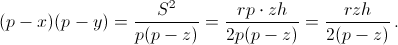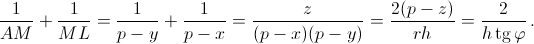 Решение 2: Обозначим через x = AC, y = CL, z = LA длины сторон треугольника ACL, через p, S и r – его полупериметр, площадь и радиус вписанной окружности соответственно, а через h – его высоту, опущенную из вершины C; пусть ∠ACL = 2φ. Из формулы Герона